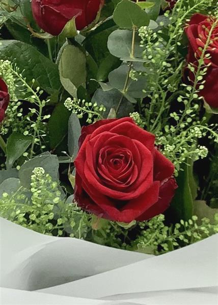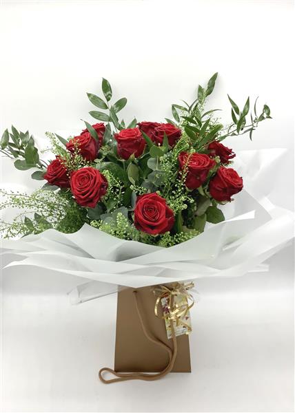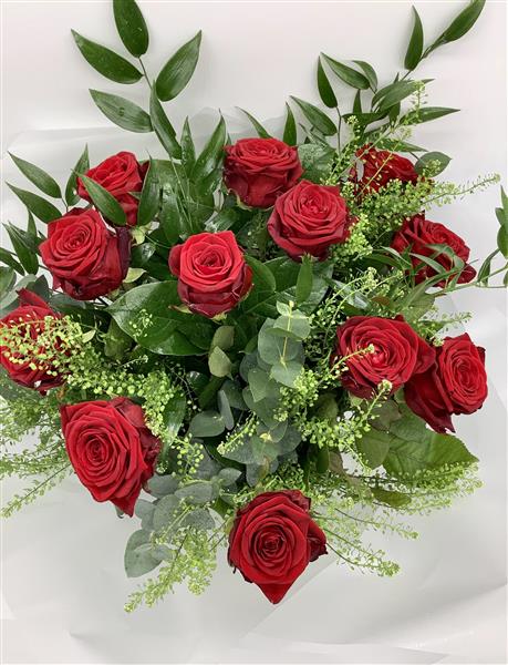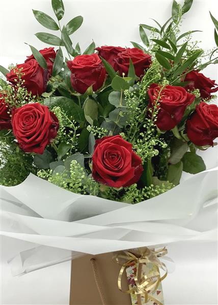 Twelve beautiful red luxury roses finished with lush foliage and greenery.