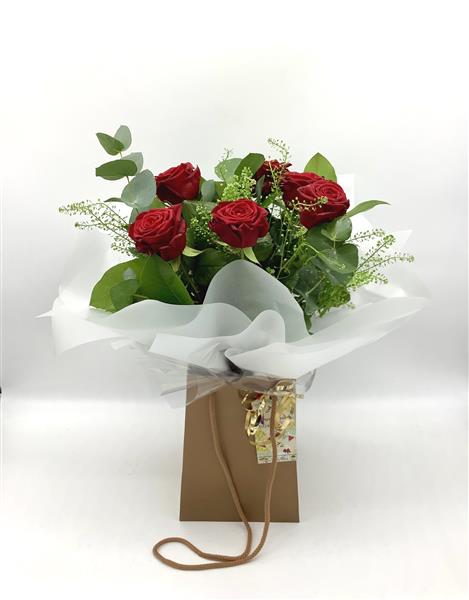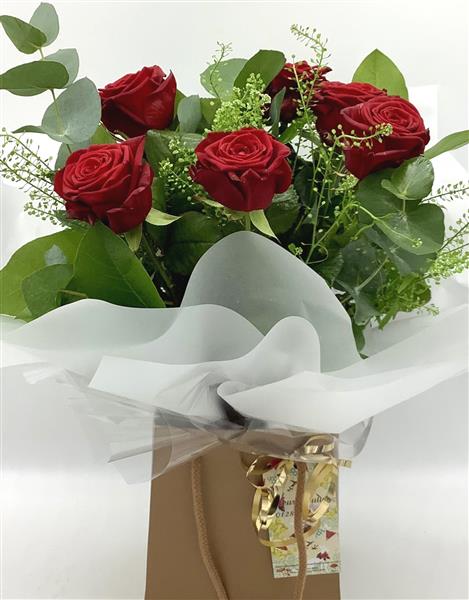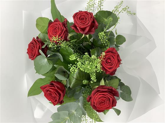 Six beautiful luxury red roses finished with lush foliage and greenery.