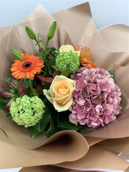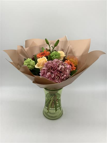 We will prepare a stylish arrangement of flowers in a glass vase and beautifully gift wrapped.